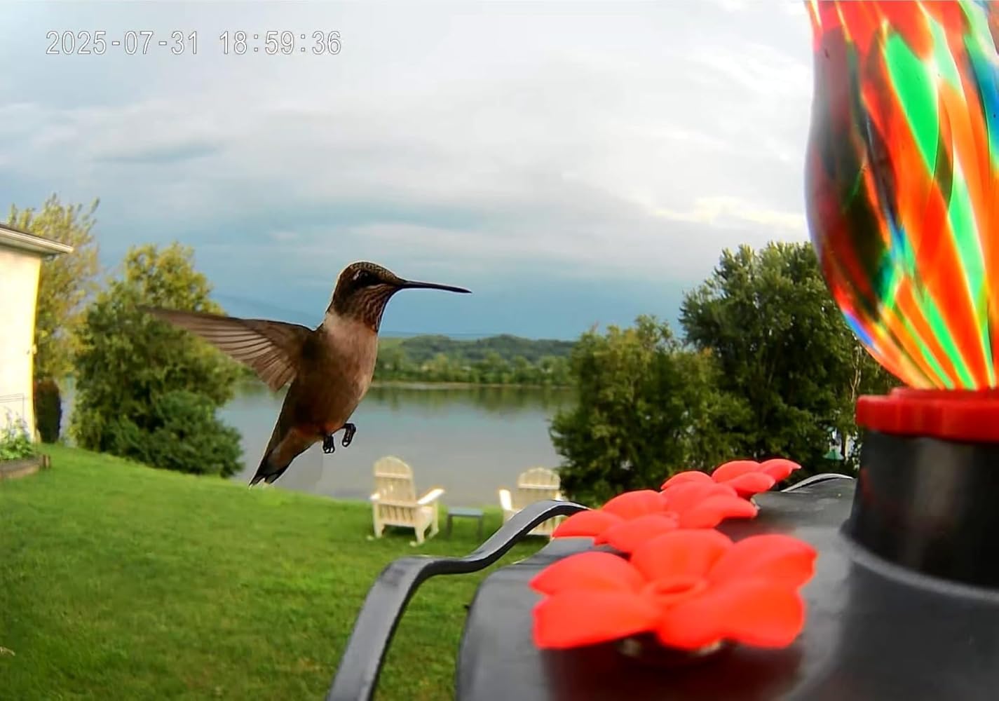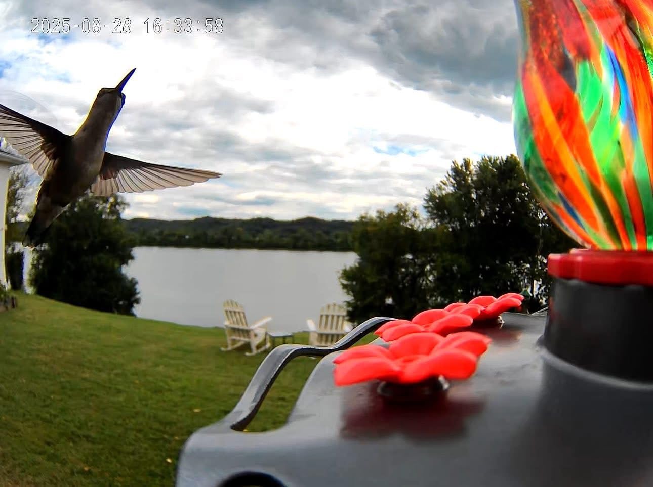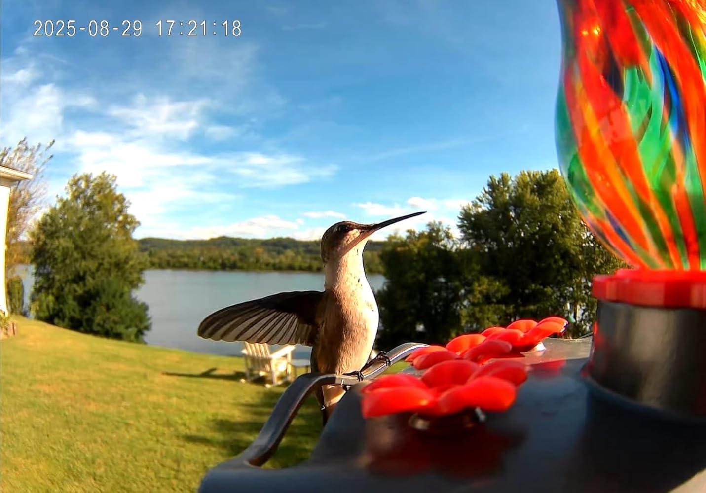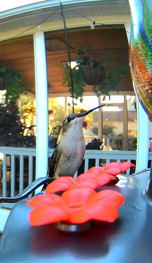 LOVE THIS & the entertainment it provides. The colorful glass globe is striking and different than other feeders. The setup is simple and easy to fill and clean. Although heavier than plastic feeders it is not cumbersome in any way. The hummingbirds we struggled to consistently attract has voraciously fed from this feeder! The camera produces high quality pictures that we share online and is enjoyed by many. I mean just look at those teensy feet!! We’ve been able to enjoy incredible detail we otherwise would not. We bought this as a gift for someone as well and they loved it along with their community bear.